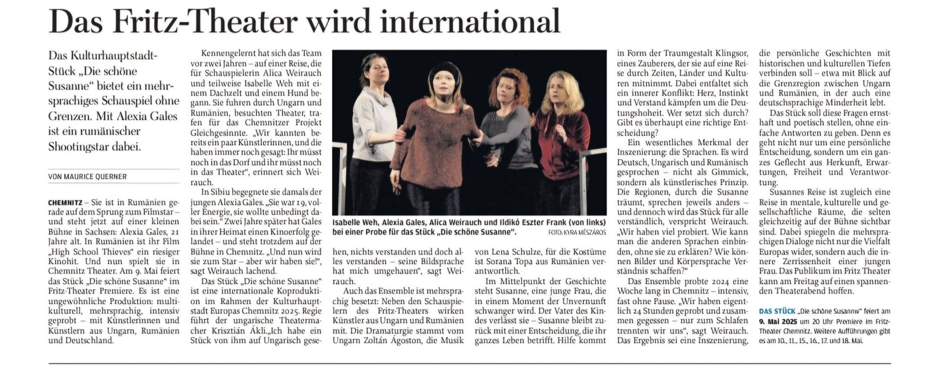 Unterstützt von der Kulturhauptstadt haben wir 2024 ein internationales Team aus Ungarn, Rumänien und Deutschland zusammengestellt, haben gemeinsam geprobt und konnten unser Projekt konkretisieren. Unser ungarisches Regie- und Dramaturgieteam erarbeitete auf Grundlage unseres Probenprozesses ein Theaterstück, welches den Titel „Die schöne Susanne“ trägt. So konnten wir 2025 damit konkret Proben und eine Vorstellung auf die Bühne bringen, welche sich inhaltlich wie folgt zusammenfassen lässt: